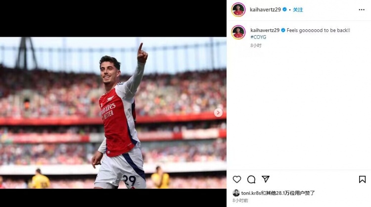 赛后,枪手攻击手哈弗茨在社交媒体庆祝球队获胜。他晒出自己庆祝进球时的照片,并配文写道:“回来感觉很好!!”。