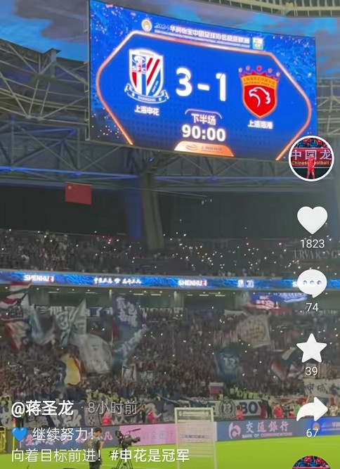 赛后,申花队球员蒋圣龙在社媒发文:“继续努力,向着目标前进!”