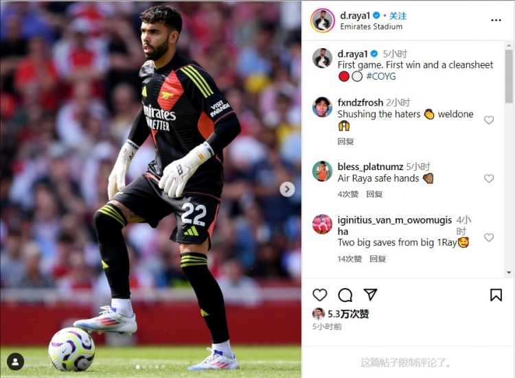 8月18日讯 昨晚,阿森纳在英超联赛中2-0击败狼队,取得新赛季开门红,赛后拉亚在社交媒体发文庆祝胜利。