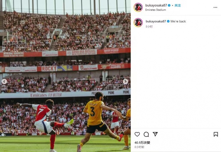 8月18日讯 本赛季英超首战,阿森纳2-0狼队,取得开门红。赛后,枪手攻击手萨卡在社交媒体庆祝球队获胜。他晒出自己射门时的照片,并配文写道:“我们回来了”。本场