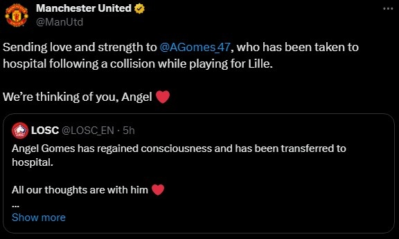 戈麦斯在场上被急救后被送往医院,随后里尔证实球员已经恢复了意识。曼联官推转发了这一消息,并写道:“为戈麦斯送去关爱和力量,他在为里尔踢球时发生碰撞,现已被送往医院,我们都心系着安赫尔。”