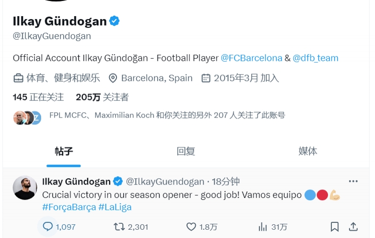 8月18日讯 今天凌晨,巴萨在西甲揭幕战取得胜利,京多安赛后发文庆祝。