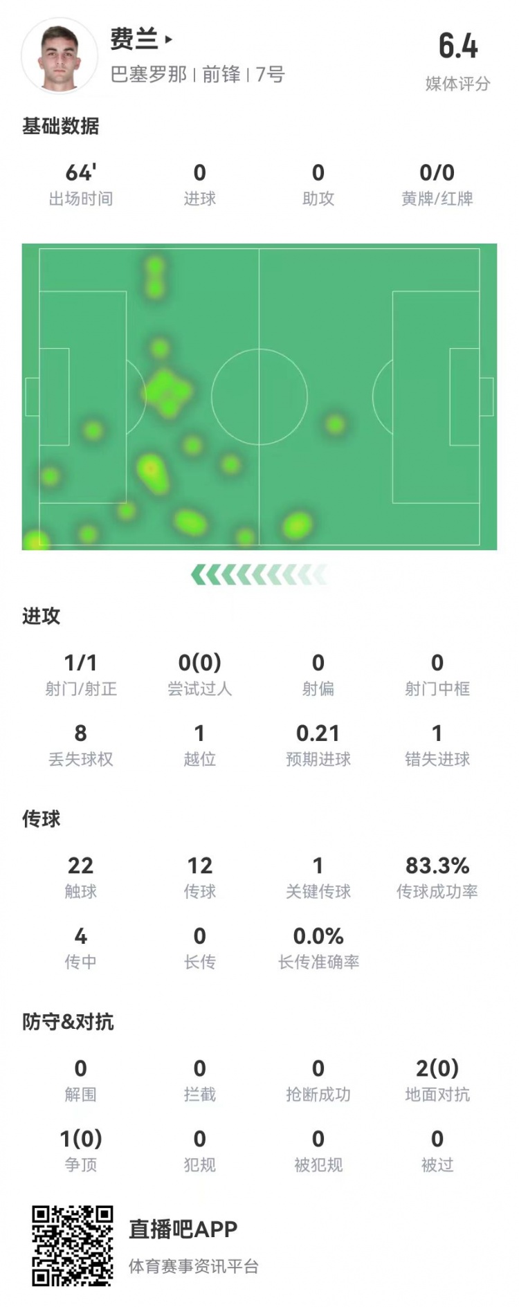 费兰本场1关键传球+1错失重大机会 3对抗0成功 6.4分全队最低