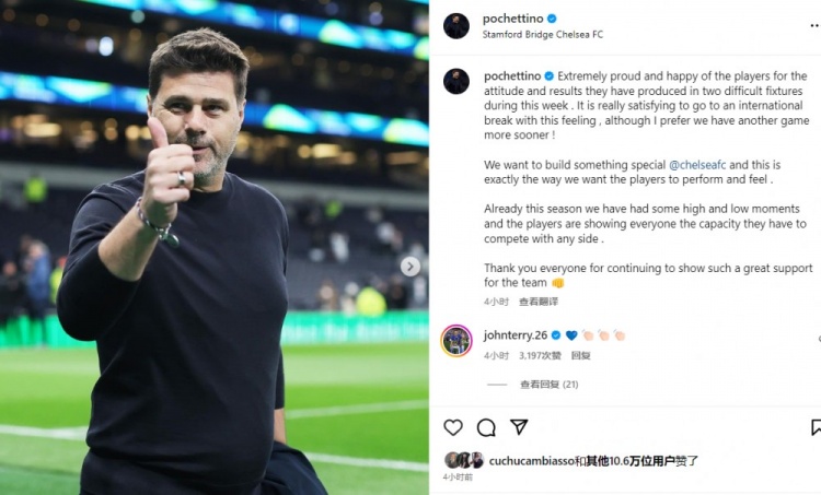 11月13日讯 英超第12轮,切尔西主场4-4战平曼城,赛后蓝军主帅波切蒂诺更新了社媒。