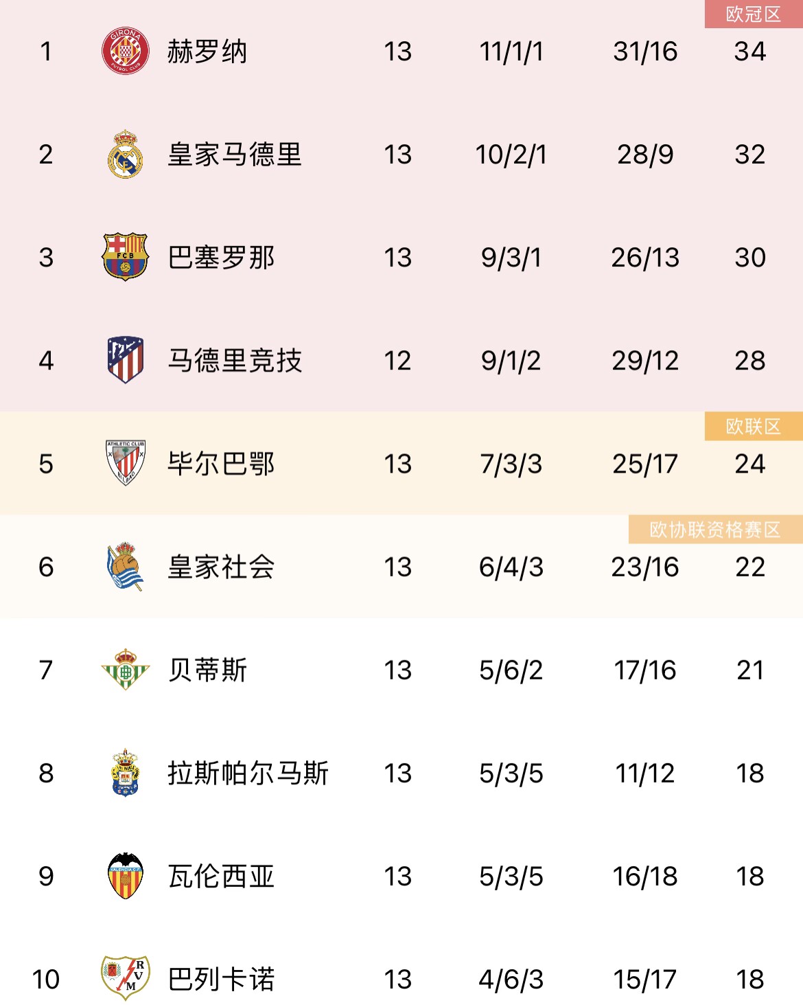 西甲进行到第13轮,赫罗纳2分优势领跑。