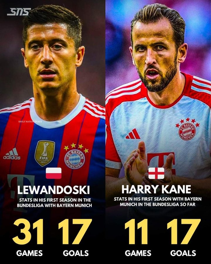 本赛季至今,凯恩11场德甲已打入17球,而莱万在拜仁的首个赛季,31场德甲比赛也只打入17球。