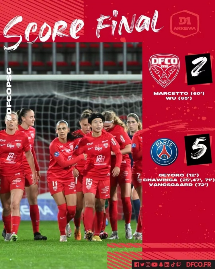 吴澄舒破门收获法女甲个人第3球,第戎女足2-5不敌巴黎圣日耳曼