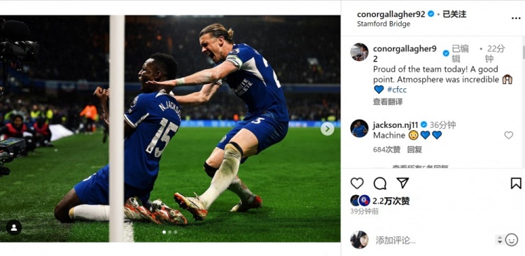 加拉格尔赛后在社交媒体上晒出庆祝进球的照片,并写道:“为球队今天的表现感到骄傲!宝贵的一分。球场氛围太棒了!”