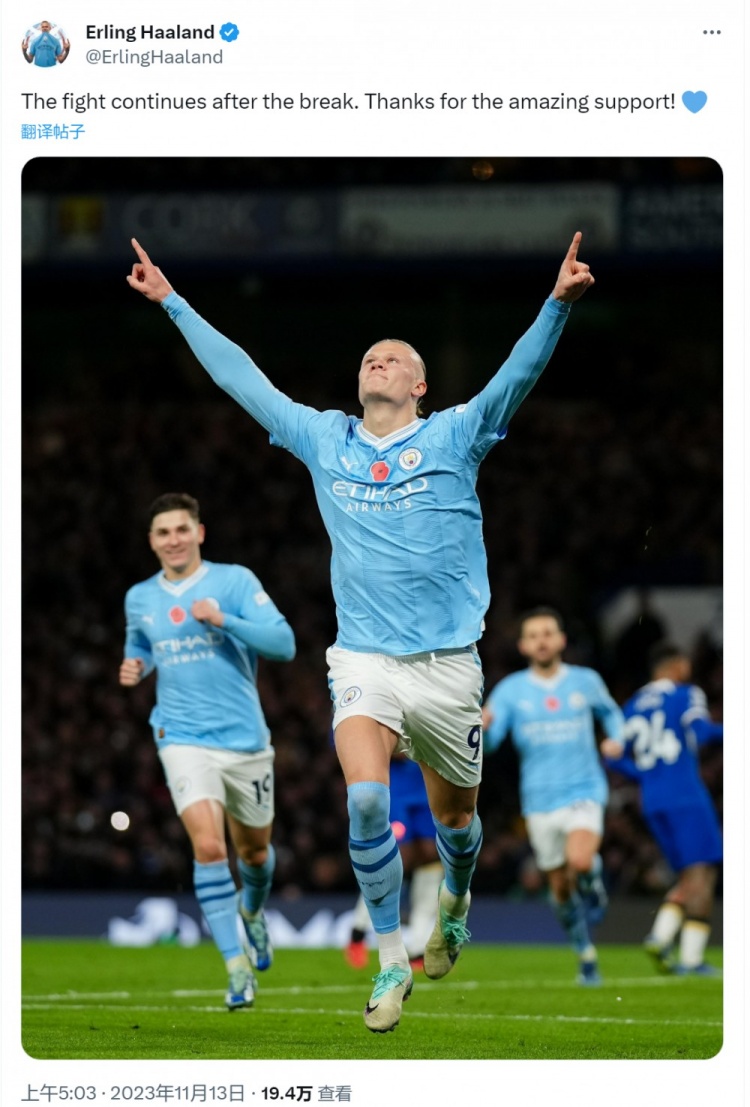 赛后哈兰德在社交媒体上晒出自己的比赛照片,并写道:“休赛期之后,战斗仍将继续进行,感谢大家的大力支持!”
