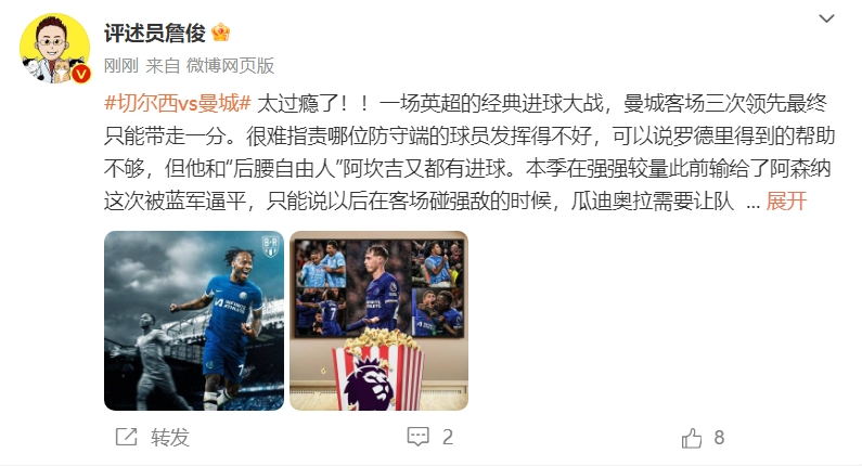 11月13日讯 英超第12轮焦点战,切尔西4-4战平曼城,贡献了一场精彩的进球大战。赛后评述员詹俊发文点评。詹俊:太过瘾了!!一场英超的经典进球大战,曼城客场三次领