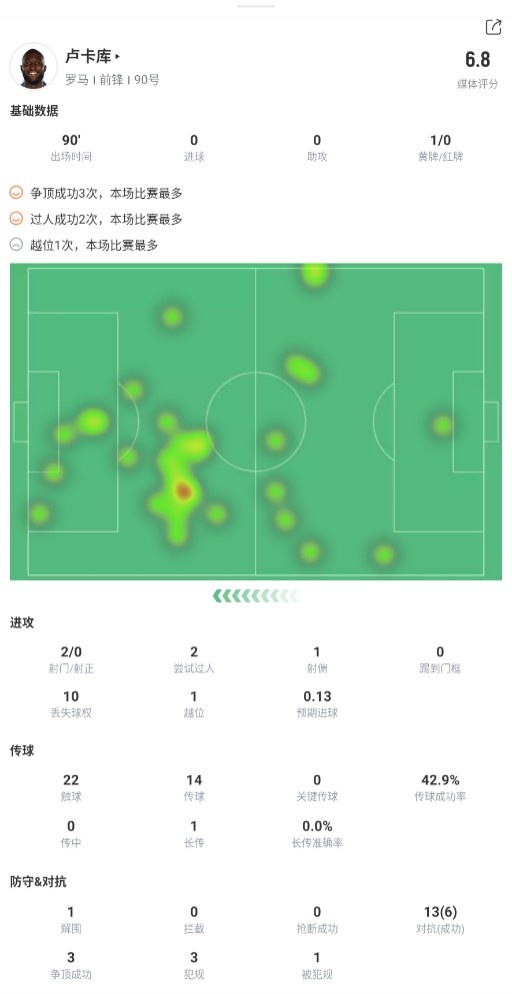 卢卡库本场数据:2次射门1次射偏,触球22次,获评6.8分