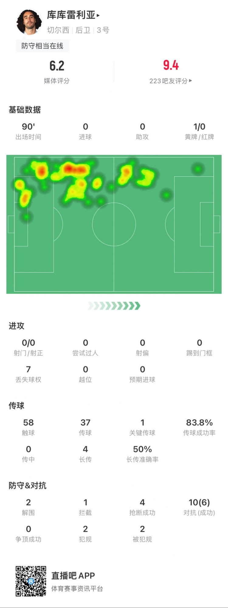 库库雷利亚全场数据:1次被判点球,2次解围,4次抢断,获评6.2分