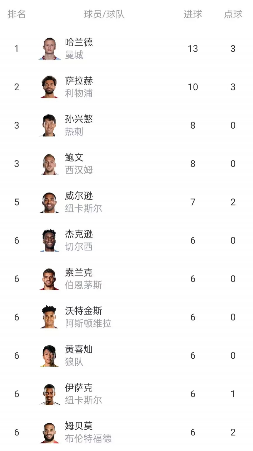 11月13日讯 英超第12轮,切尔西4-4绝平曼城。最新英超积分榜:1、哈兰德(曼城):13球2、萨拉赫(利物浦):10球3、孙兴慜(热刺):8球3、鲍文(西汉姆):8球5、威尔逊(纽卡):7球6、索
