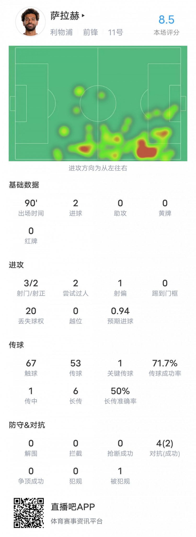 萨拉赫本场比赛具体数据如下:
