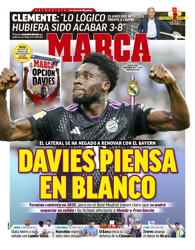 11月14日讯 马卡报头版消息,拜仁左后卫阿方索-戴维斯希望加盟皇家马德里,他拒绝与拜仁续约。