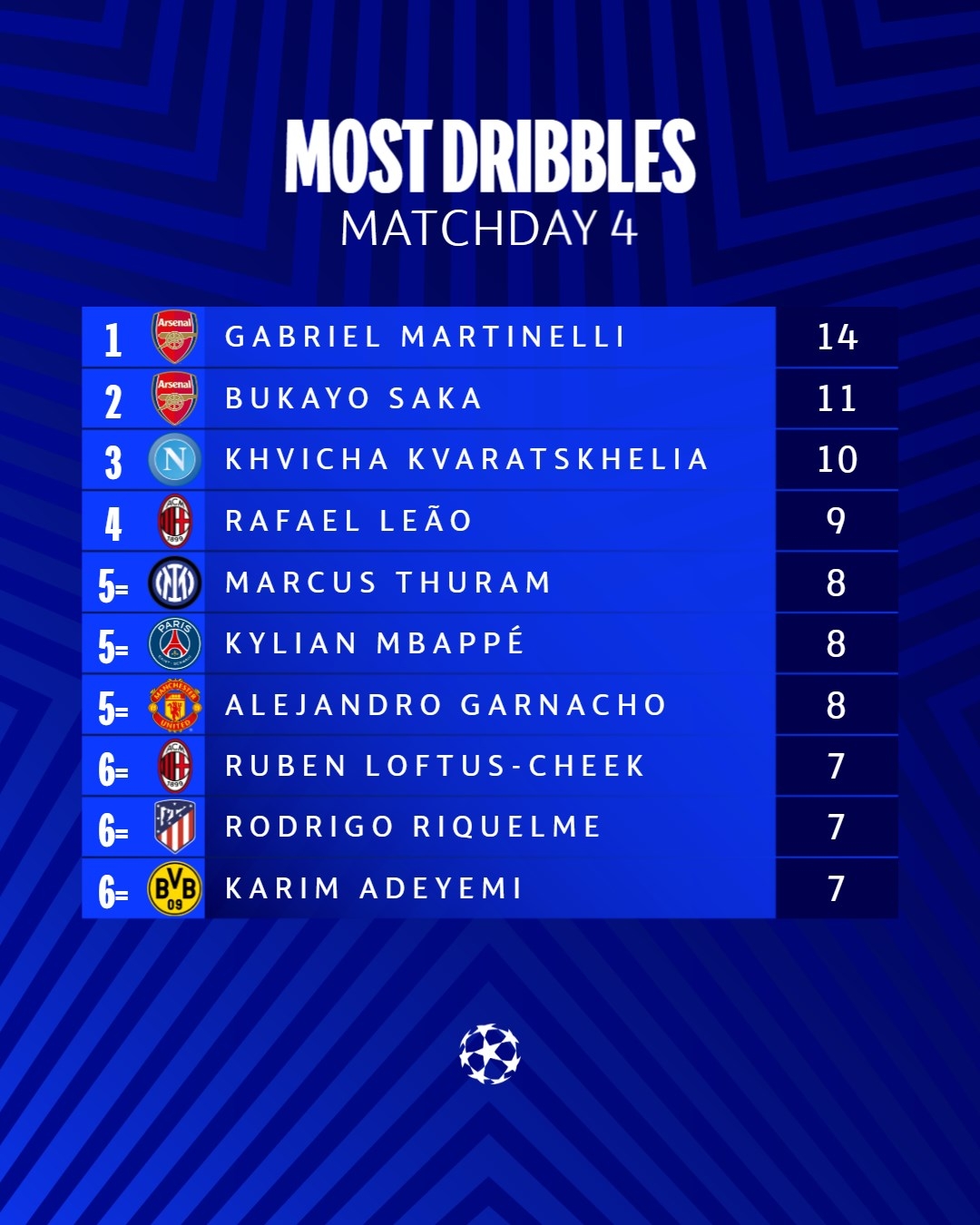 11月14日讯 欧冠小组赛已经结束了第4轮的争夺,赛事官方统计了本轮比赛球员盘带榜,阿森纳边锋马丁内利14次居首,另外一名阿森纳边锋萨卡则以11次位居次席。以