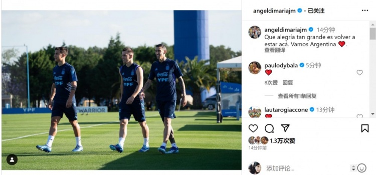 迪马利亚晒国家队训练照:回到这里真开心,加油阿根廷❤️