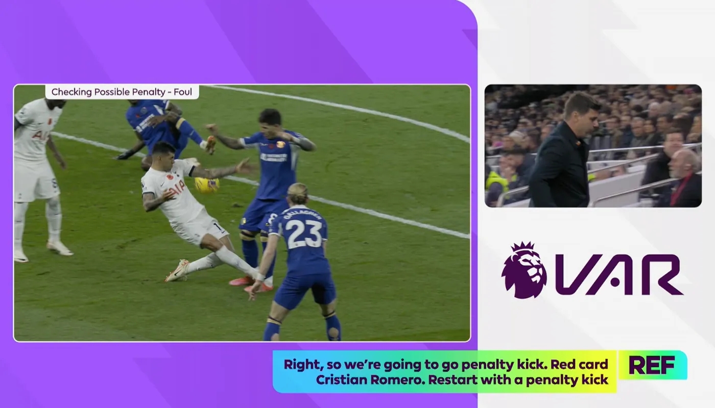 “那么让我们看看在这之前发生了什么,罗梅罗冲向恩佐……是的,抢到了球,但脚踝上方的接触最终导致了点球和红牌的判罚。这个过程非常出色。”