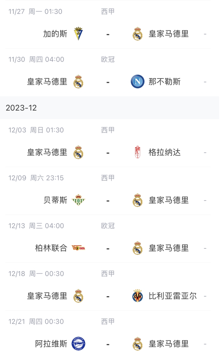 到年底前,皇马在西甲和欧冠还有7场比赛: