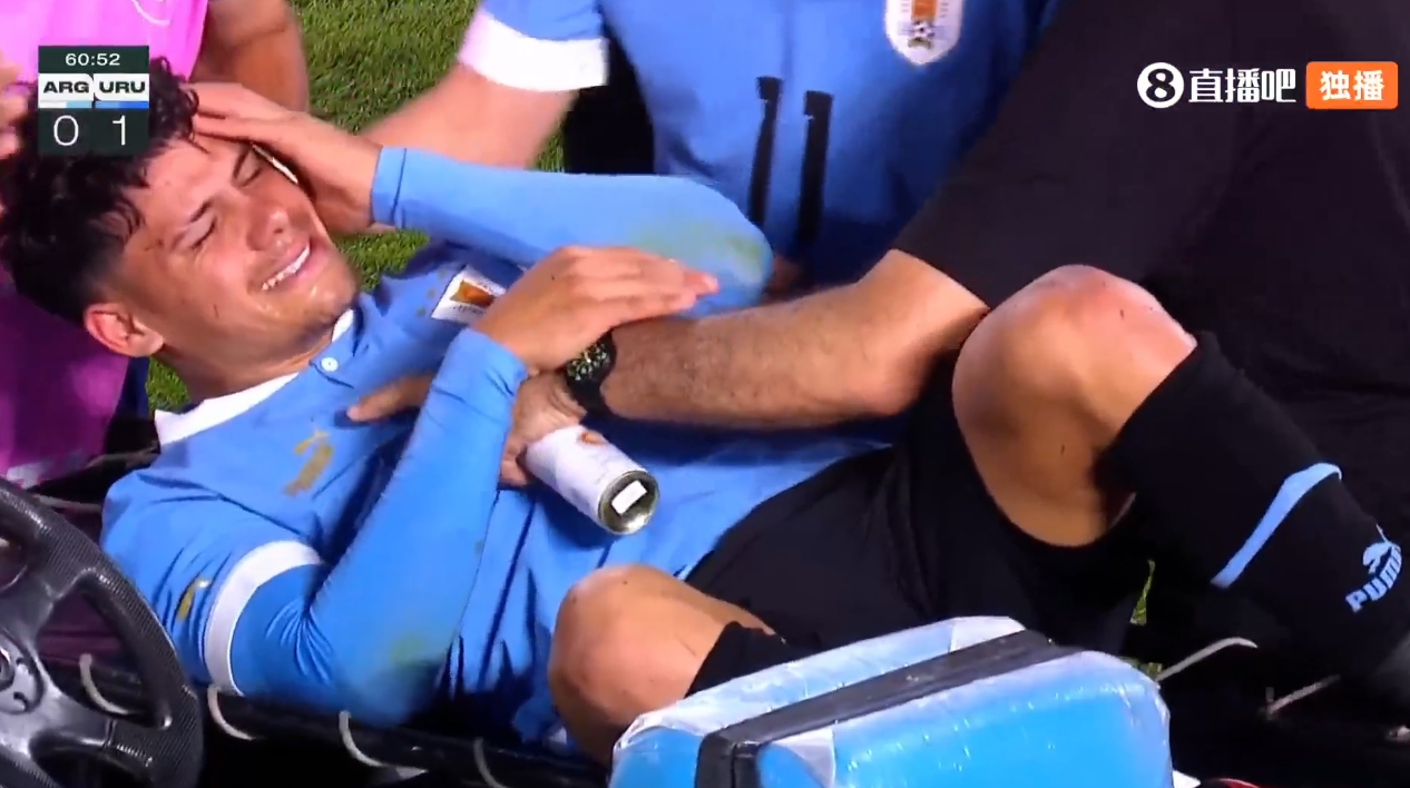 11月17日讯 世预赛阿根廷vs乌拉圭,第59分钟,M-阿劳霍与德保罗发生对抗后,泪洒赛场被担架抬离球场。