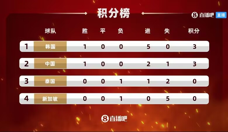 首轮过后,韩国、中国3分分列前二,泰国第三,新加坡垫底。
