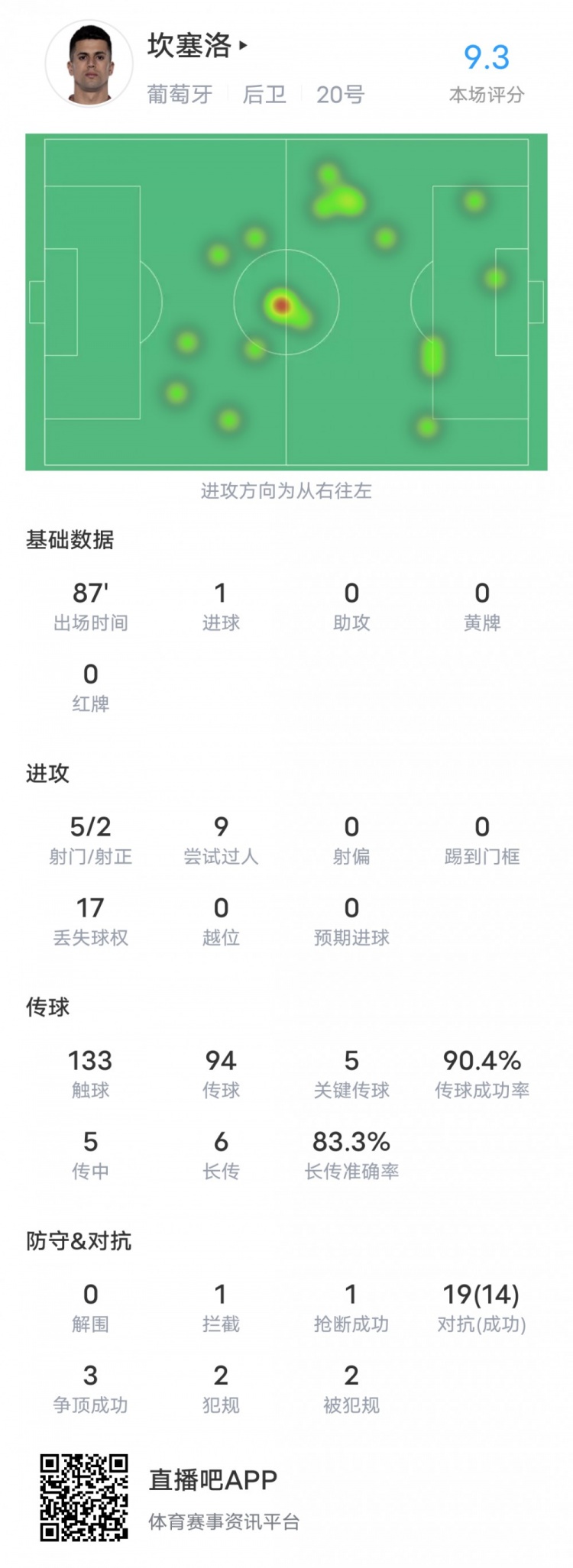 坎塞洛本场数据:1进球8成功过人5关键传球,评分9.3全场最高