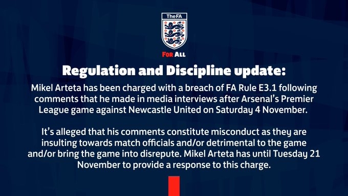 米克尔-阿尔特塔在11月4日星期六阿森纳对阵纽卡斯尔联队的英超比赛后,接受媒体采访时发表的言论,被指控违反英足总规则E3.1。他的言论构成不当行为,因为这些言论侮辱了比赛官员/或损害了联赛/或使联赛名誉扫地。