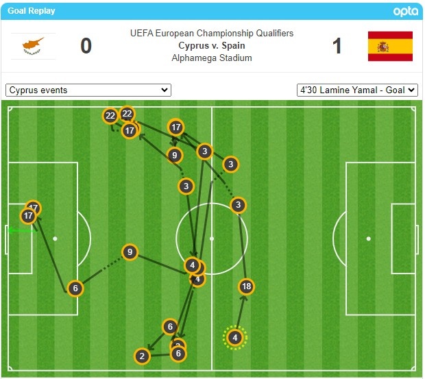 11月17日讯 西班牙vs塞浦路斯,亚马尔开场5分钟便攻入一球,据opta统计,在这粒进球前,西班牙队经历了22脚传球,是西班牙队本届欧预赛进球前传球次数最多的一次。