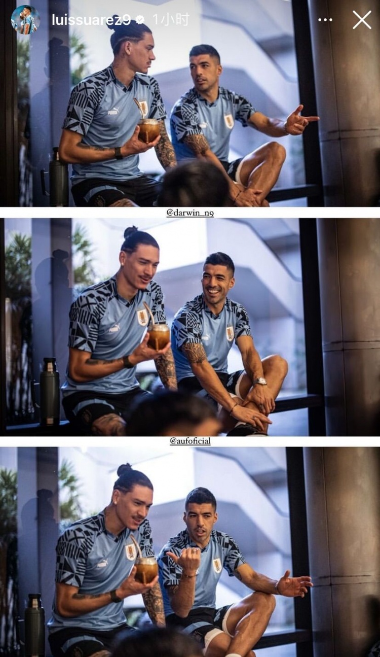 赛前,苏亚雷斯晒出和努涅斯的合照,努涅斯手捧马黛茶,苏亚雷斯比划着手势,两人有说有笑。