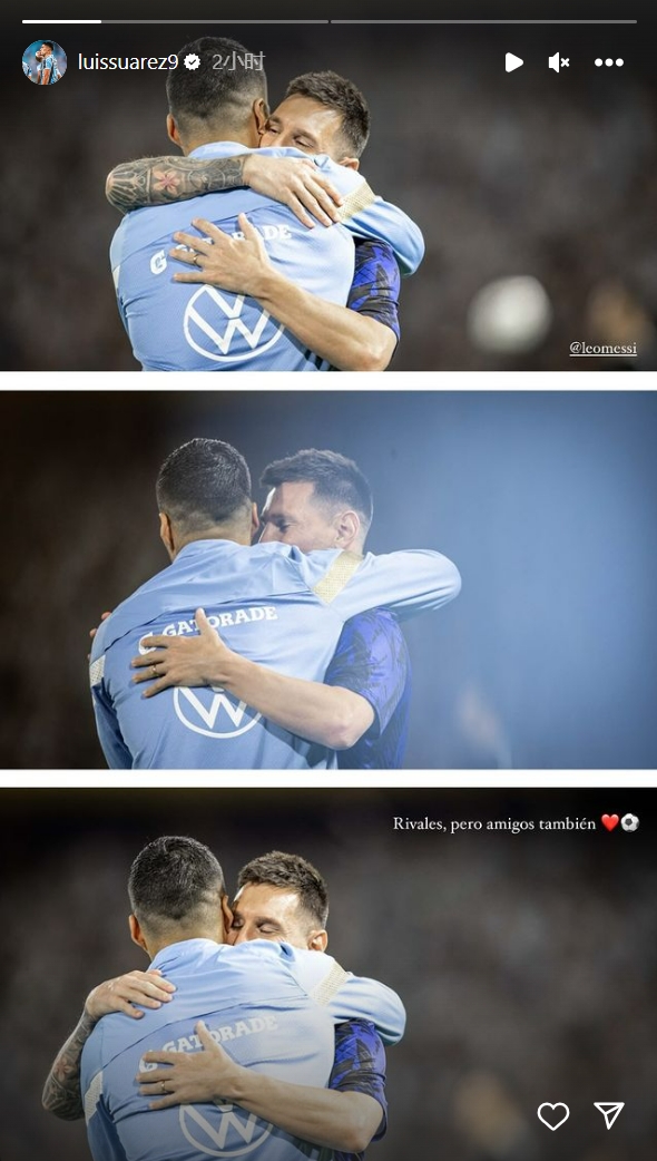 老友重逢!苏牙晒与梅西相拥照:是对手,也是朋友❤️⚽