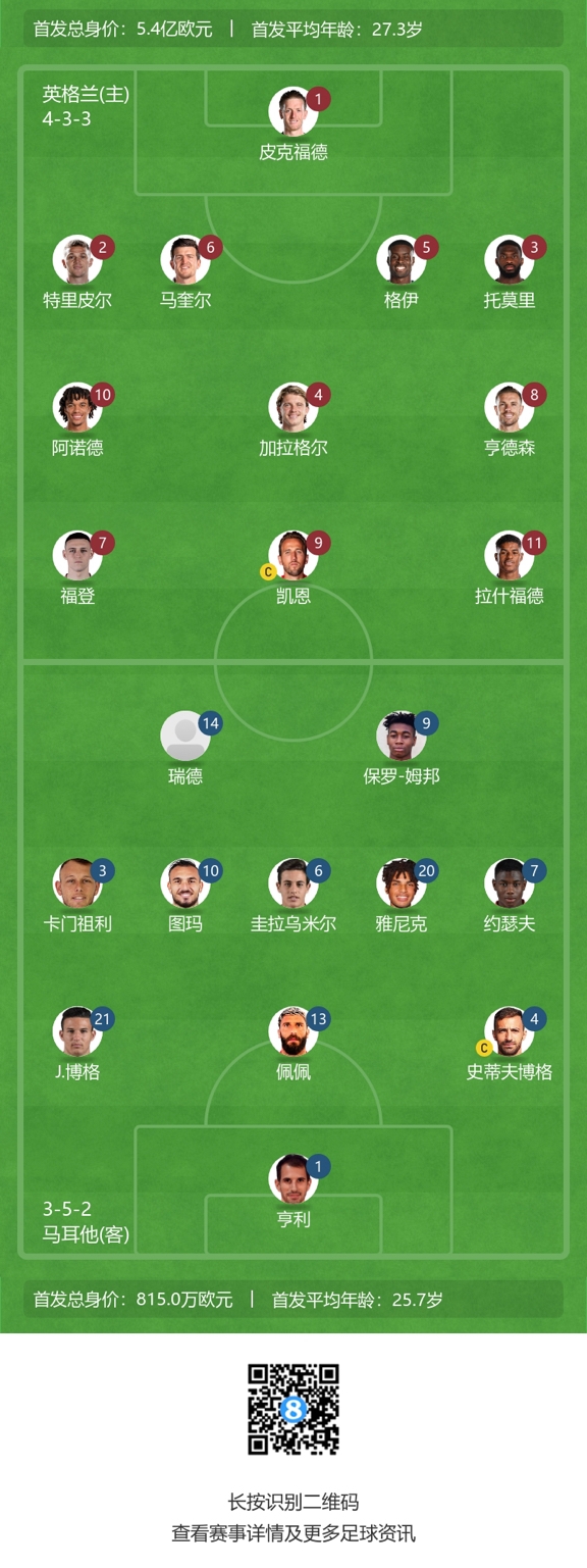 英格兰首发:1-皮克福德、2-特里皮尔、3-托莫里、4-加拉格尔、5-格伊、6-马奎尔、7-福登、8-亨德森、9-凯恩、10-阿诺德、11-拉什福德