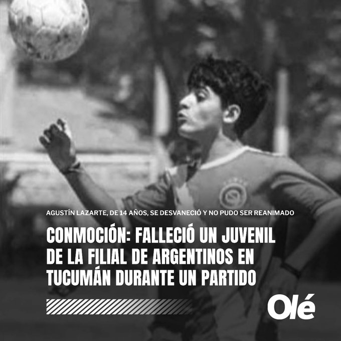 11月19日讯 据阿根廷媒体《号角报》的消息,阿根廷14岁小球员拉萨尔特在比赛中突然晕倒去世。拉萨尔特在图库曼的阿根廷青训招募中心的青年队踢球,他在塔纳利