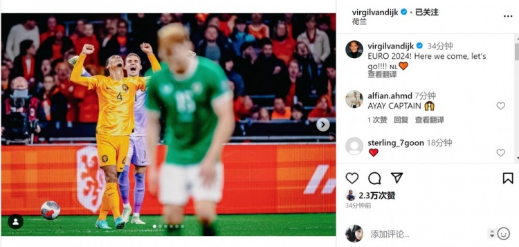 荷兰队长范迪克在社交媒体上晒出比赛照片,庆祝球队晋级欧洲杯正赛,他写道:“2024年欧洲杯!我们来了,加油!”