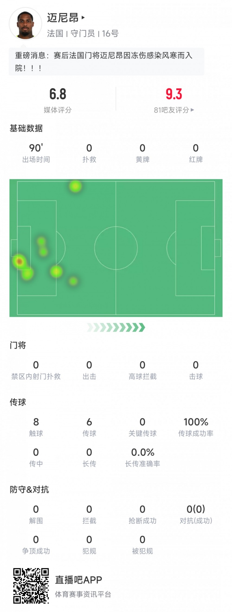 法国队首发门将迈尼昂全场没什么表现机会,以下为其本场比赛关键数据: