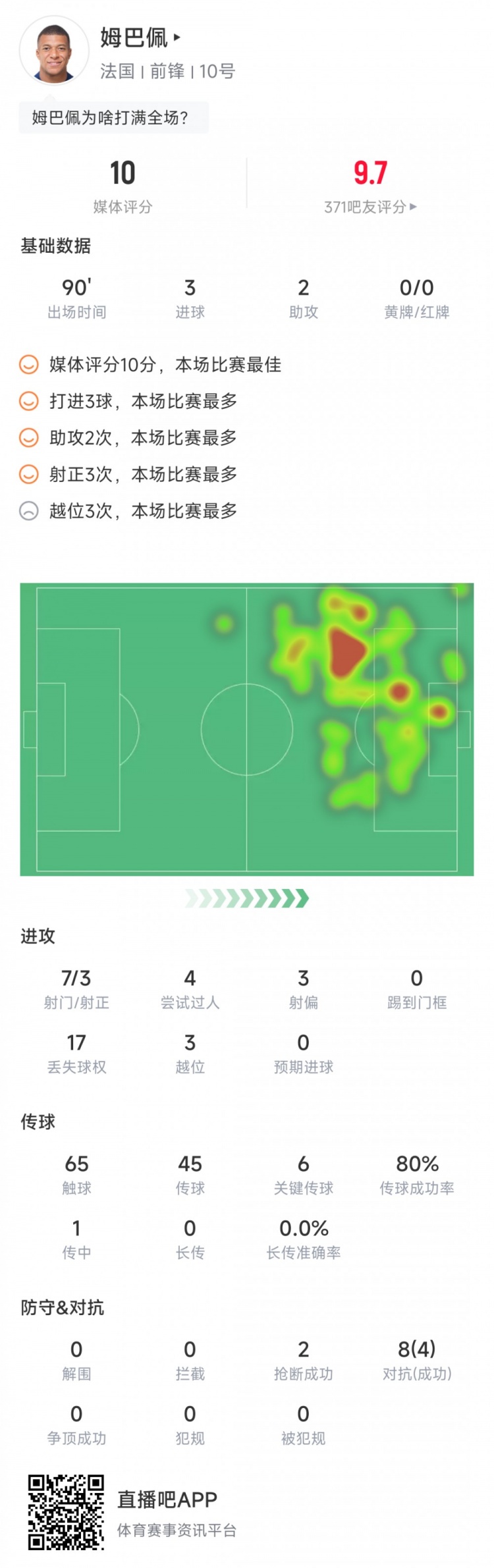 姆巴佩本场数据:帽子戏法,2次助攻,评分10分