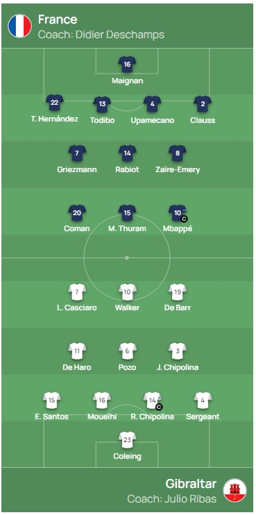 11月19日讯 欧预赛B组第9轮,法国主场对阵直布罗陀。赛前,官方公布了本场的首发名单。