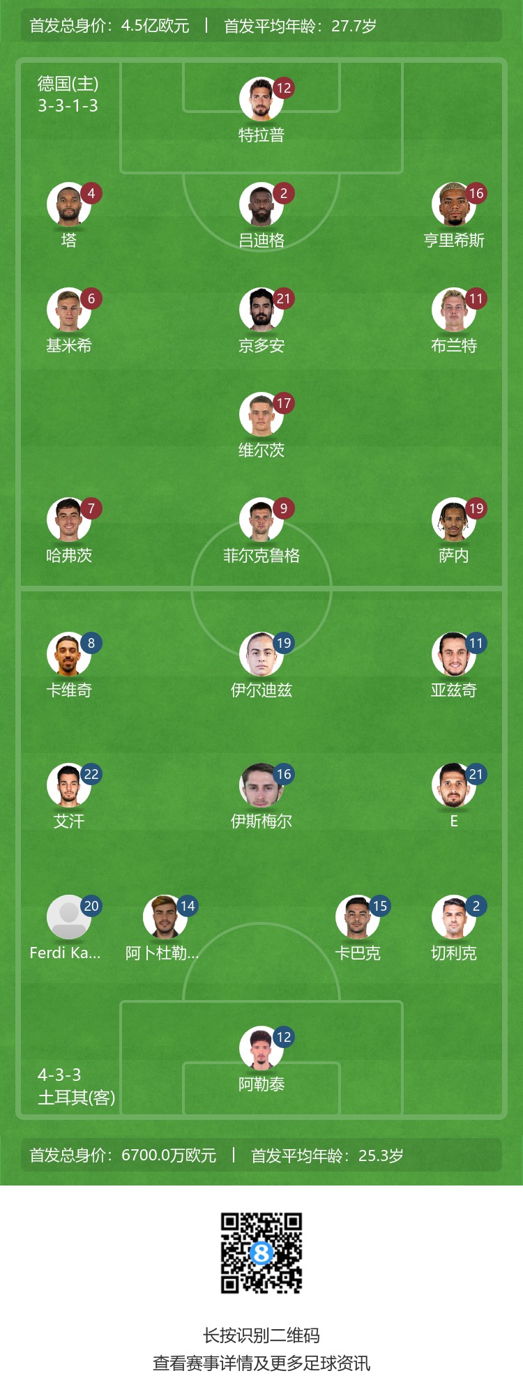 11月19日讯 友谊赛对阵,德国迎战土耳其比赛即将打响。赛前首发出炉。