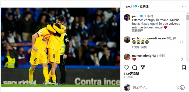 佩德里社媒鼓励加维:我们与你同在,你会以更强大的姿态回归