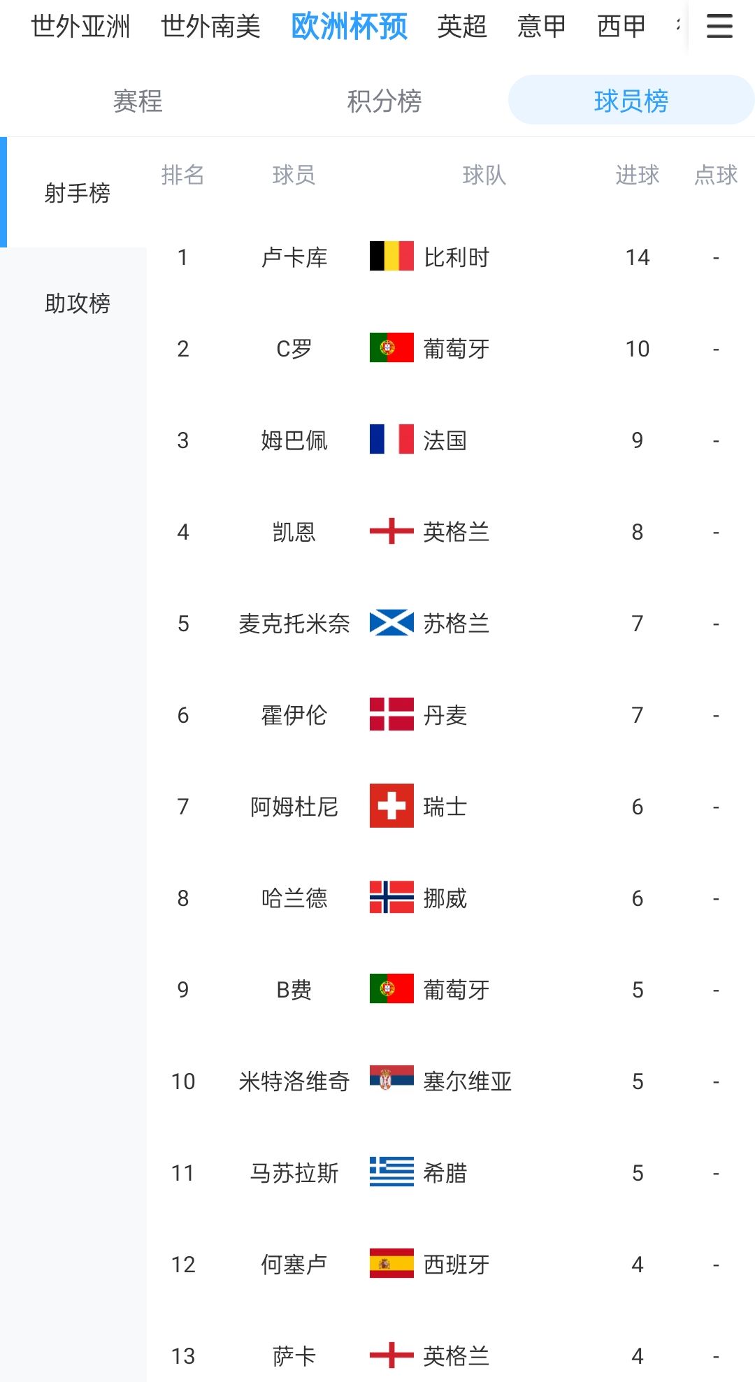 欧预赛射手榜,卢卡库以14球高居榜首,C罗10球第二,姆巴佩9球第三,凯恩8球第四,麦克托米奈、霍伊伦7球并列第五。