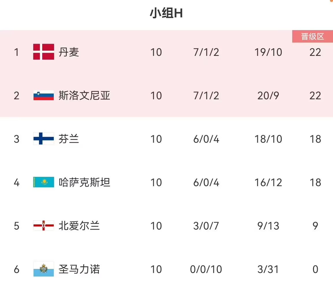欧预赛H组,丹麦、斯洛文尼亚均拿到了7胜1平2负的战绩,以组内前两名的身份晋级。芬兰与哈萨克斯坦都是6胜4负分列三、四位,两队还有附加赛资格。北爱尔兰3胜7负第五遭淘汰,圣马力诺10场全败垫底出局。