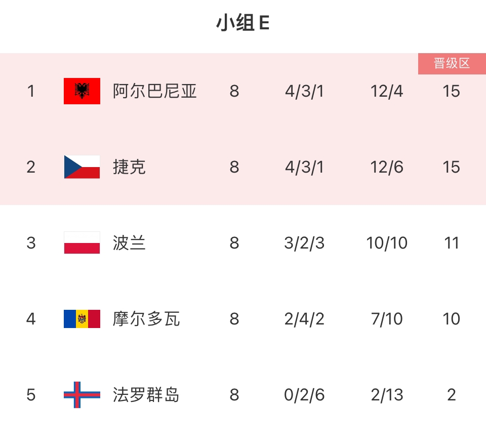 11月21日讯 欧预赛E组小组赛收官,阿尔巴尼亚0-0法罗群岛,捷克3-0摩尔多瓦。最终阿尔巴尼亚和捷克以小组前二直通欧洲杯,波兰无缘直通但有附加赛资格,摩尔多瓦