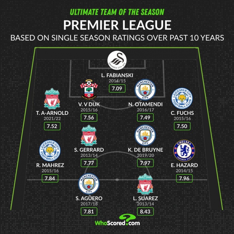 WhoScored英超十年来单赛季评分最高阵容:曼城红军各三人